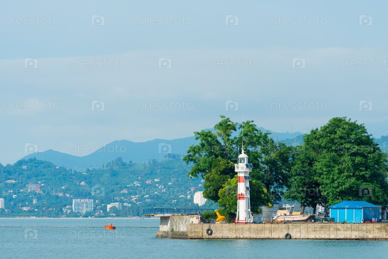 Полосатый маяк на берегу города, фото в ясный день