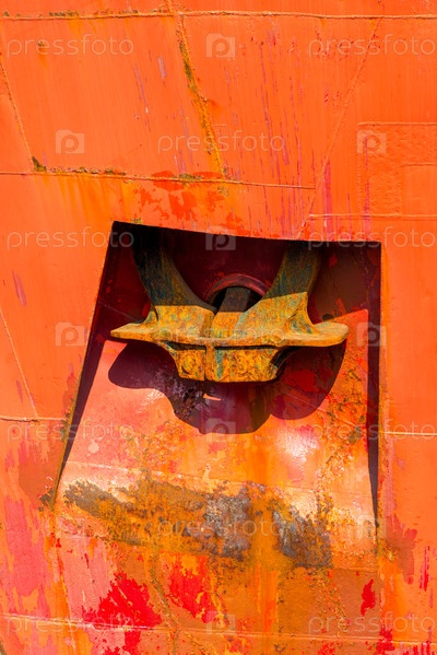 Ржавый красный якорь корабля крупным планом
