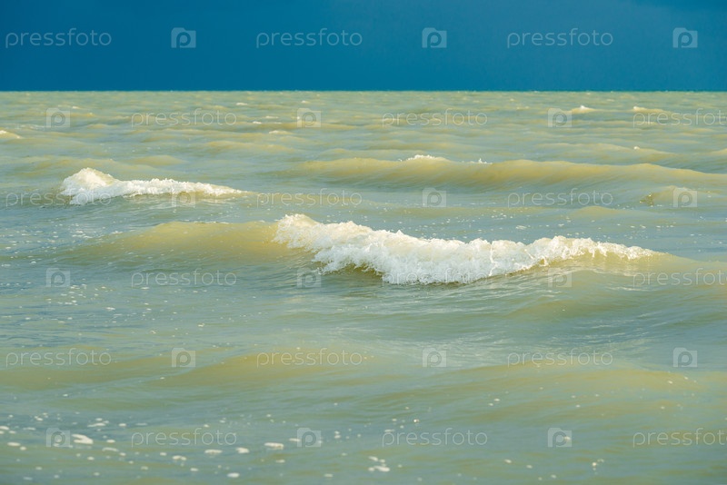 Море и голубое драматическое небо. прилив в море во время синих сумерек в пасмурную погоду