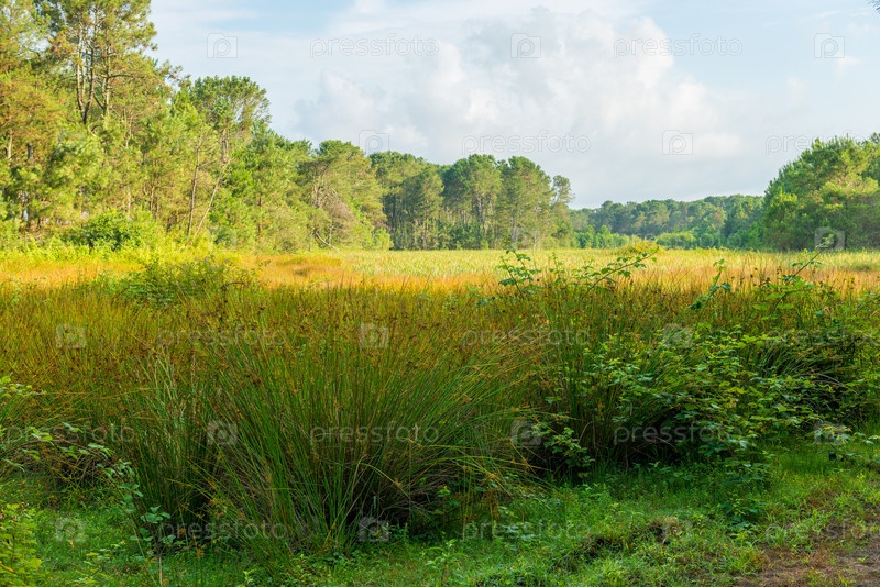 Пышные зеленые травы растут в болотах, болотах и лесах на заднем плане