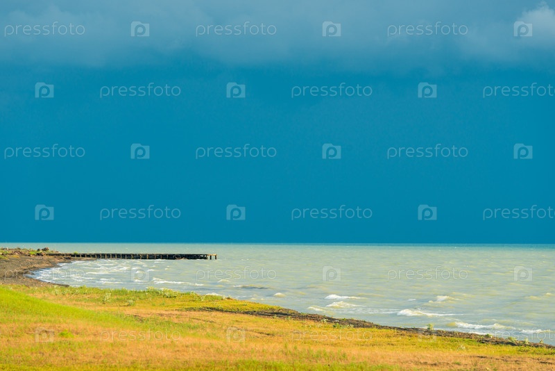 Море и голубое драматическое небо. прилив в море во время синих сумерек в пасмурную погоду