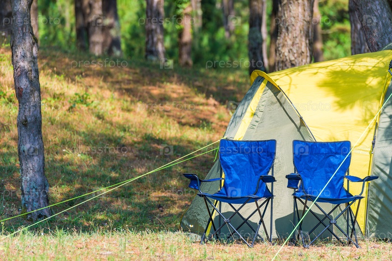 Два кресла возле палатки в сосновом лесу в солнечный день
