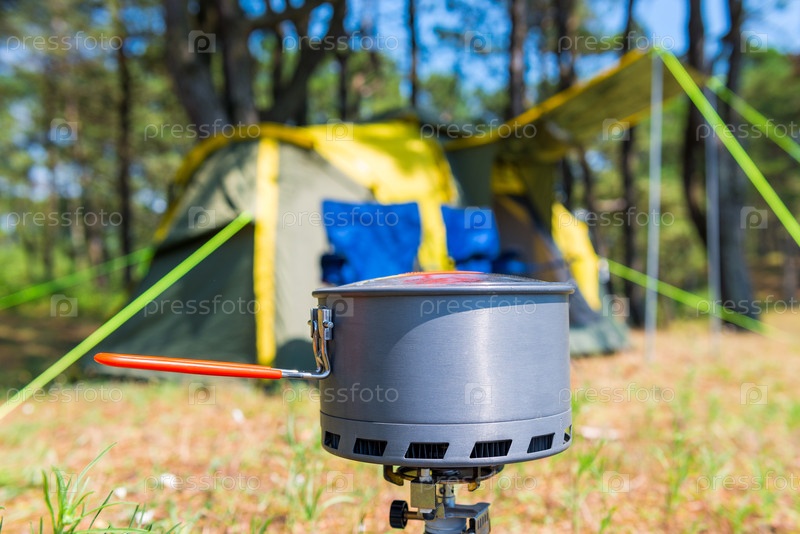 Кастрюля для приготовления пищи на газовой горелке в походе крупным планом на фоне палатки для кемпинга