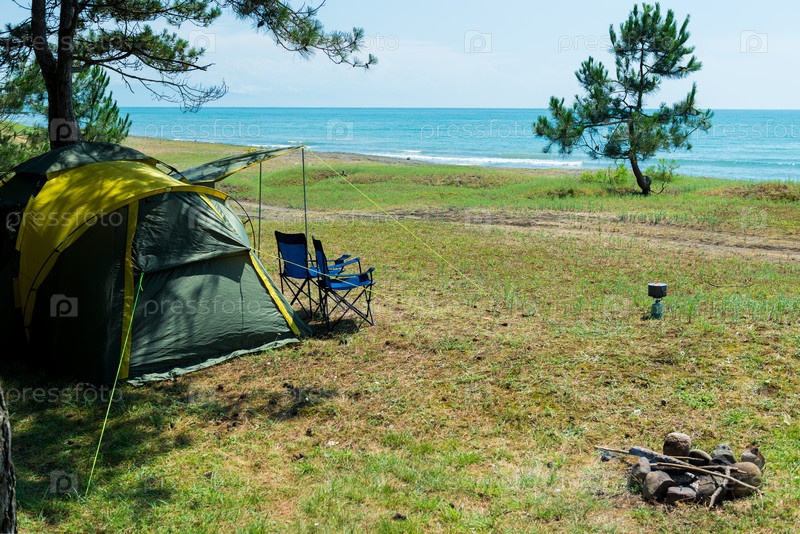 Кемпинг у моря, без людей, палатка для кемпинга и два стула в живописном месте