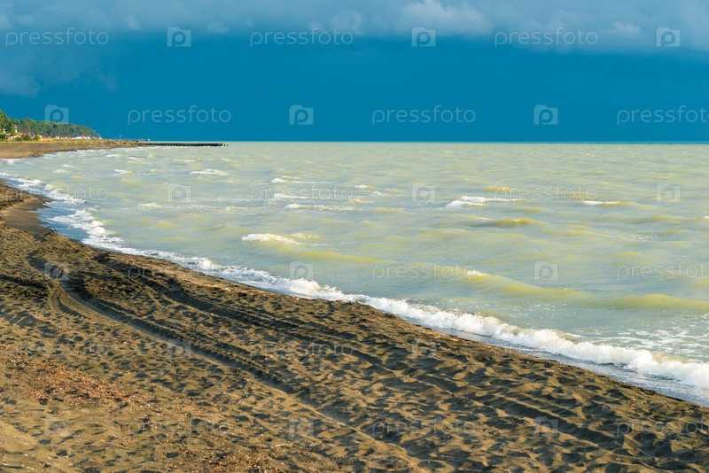 Море и голубое драматическое небо. прилив в море во время синих сумерек в пасмурную погоду