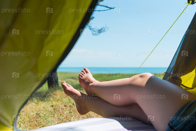 Женщина, отдыхающая в палатке у моря, в стопной раме, стреляющая внутри палатки