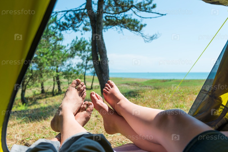 Мужчина и женщина отдыхают в палатке, в рамке для ног
