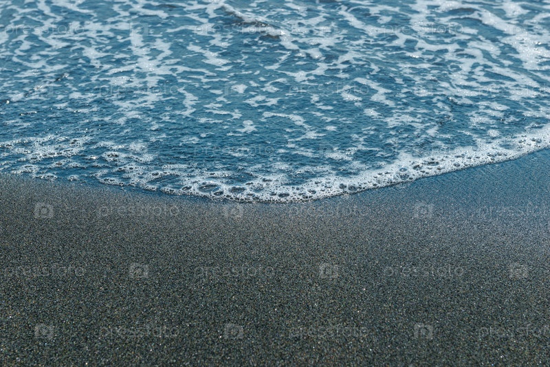Волна белой пены на черном песчаном пляже крупным планом