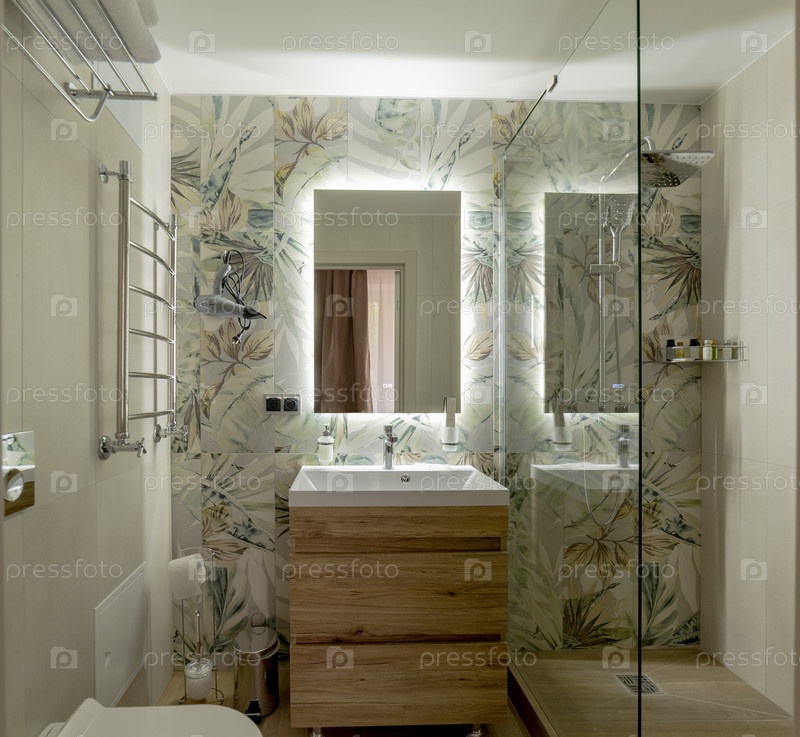 Интерьер современной ванной комнаты с душевой кабиной и подсветкой зеркала