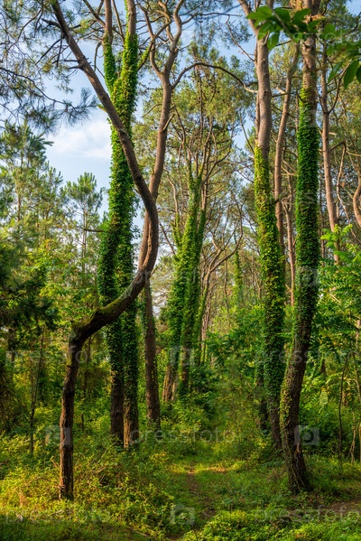 Стволы деревьев в смешанном лесу, покрытом плющом