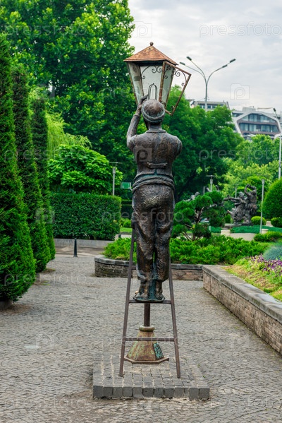 Тбилиси, Грузия - 20 июня 2018 года: Скульптура мужчины на лестнице заменяет лампочку в фонаре, Тбилиси, Грузия