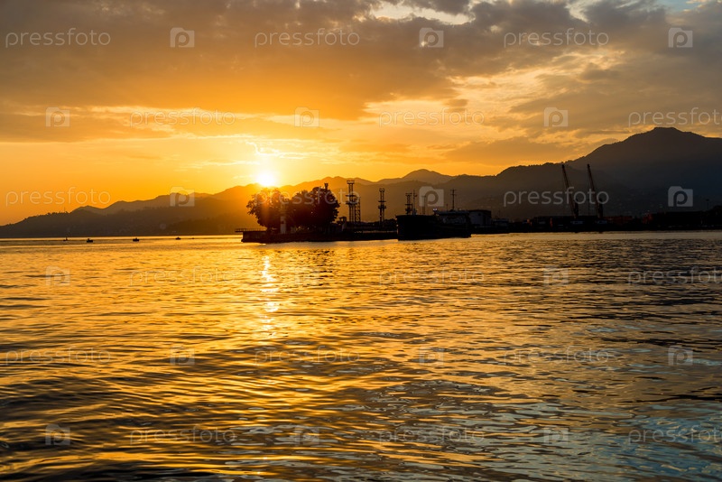Красивый закат на море, вид на морской порт
