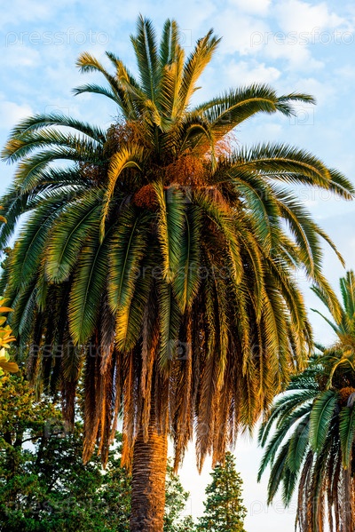 Высокая финиковая пальма растет на курорте недалеко от моря, крупным планом
