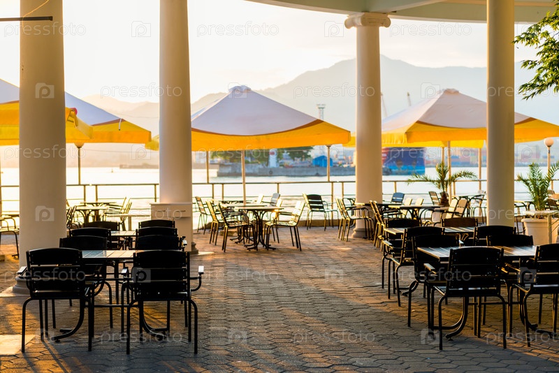 Пустое летнее уличное кафе возле моря на закате