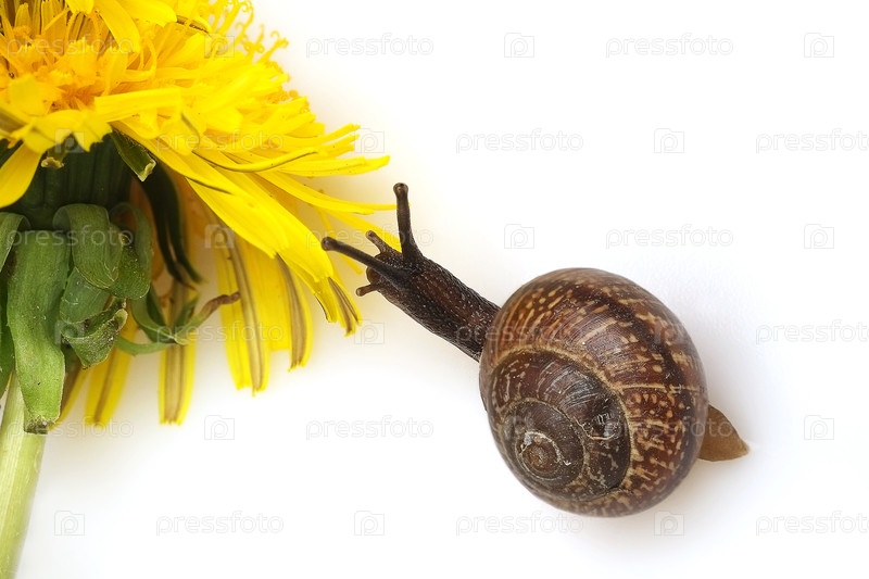 Улитка ползает к одуванчику, изолированному на белом фоне