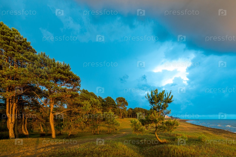 Пляж и море в пасмурный день в тени соснового пейзажа