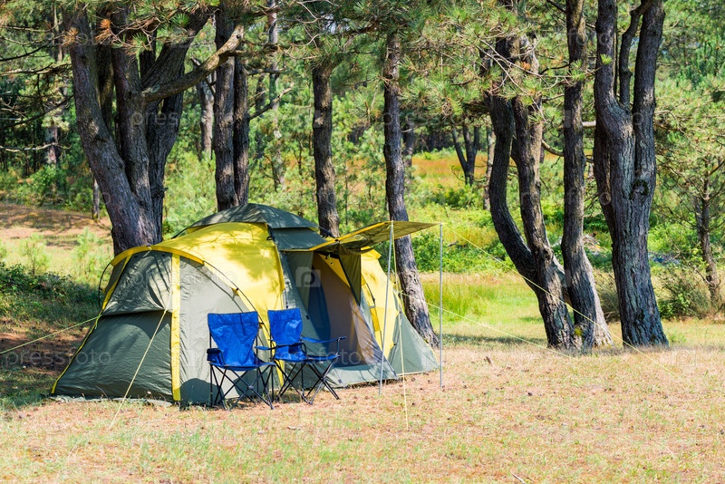 Палатка для кемпинга и пара стульев в живописном месте среди сосновых деревьев