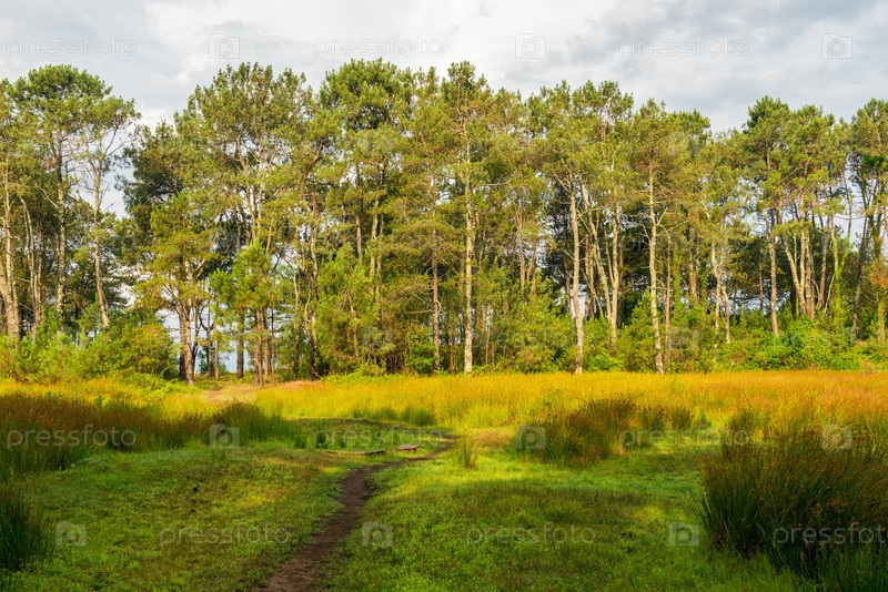 Пышные зеленые травы растут в болотах, болотах и лесах на заднем плане