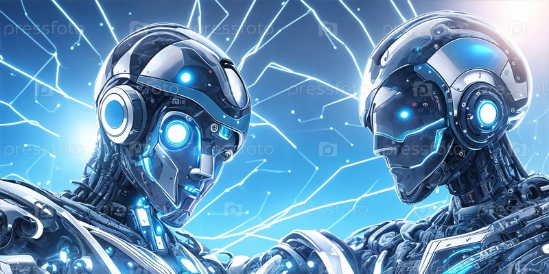 Футуристический образ двух роботов. Цифровой фон. ИИ генеративный