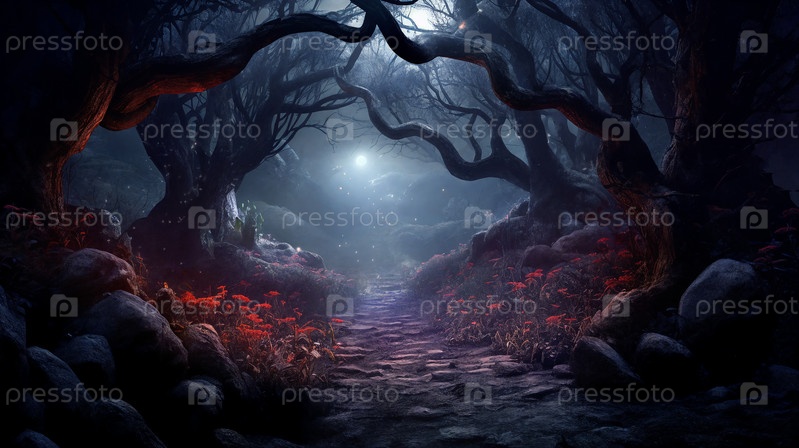 Иллюстрация жуткого леса раскрывает эфирное царство, окутанное тайной. Генерирующий ИИ
