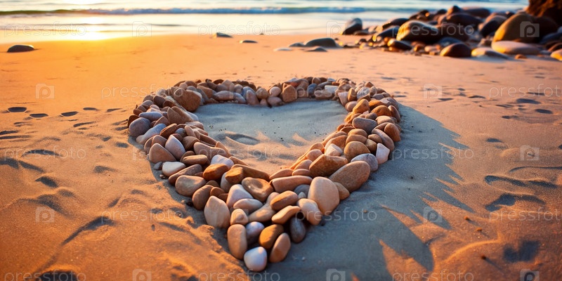 Камни в форме сердца на песчаном пляже, освещенные теплыми цветами заката