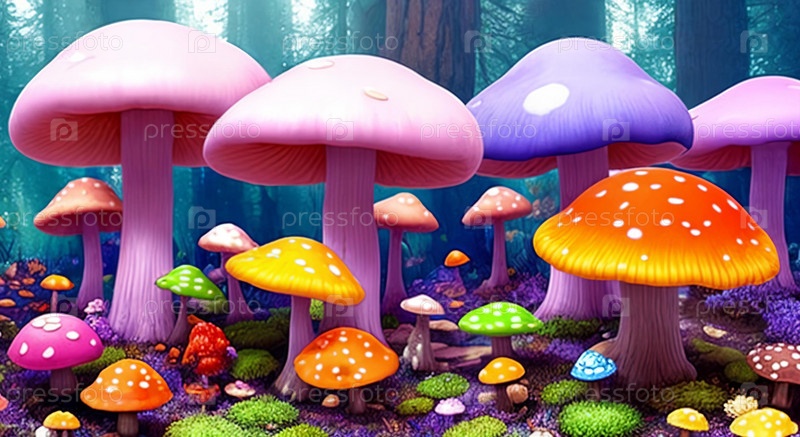 Погружение в причудливый яркий грибной лес Негабаритные грибы различных оттенков рисуют сюрреалистическую, потустороннюю сцену