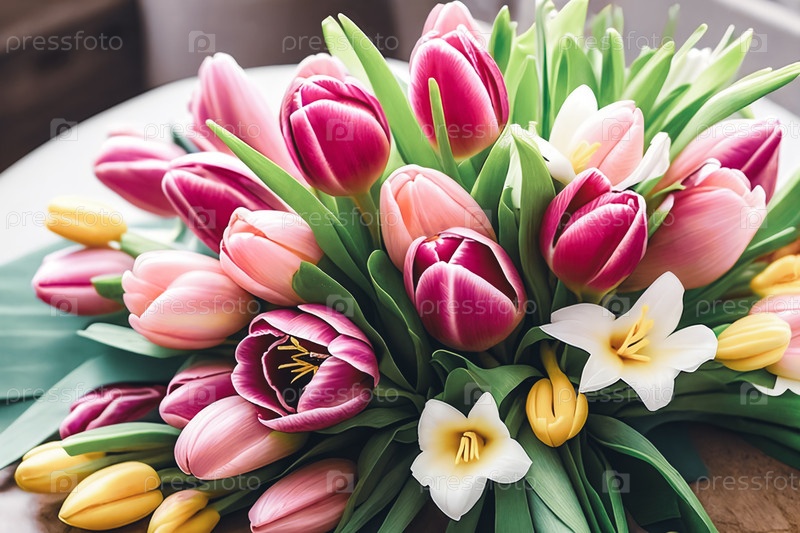Пасхальное цветочное наслаждение. Композиция с разнообразными свежими весенними цветами тюльпанов, расположенных в декоративной пасхальной тематике, подчеркивая яркие цвета и нежные лепестки