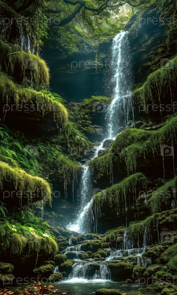 Зачарованный водопад. Водопад каскадирует вниз по покрытым мхом скалам, открывая секретный грот за его завесой. Кристалло-чистая вода сверкает намеками на магию, а по берегам цветут красочные цветы