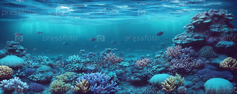 Подводное царство с коралловыми рифами и голубой водой. ИИ генерируется