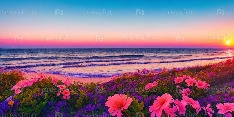 Яркий цветок цветет на песчаном пляже, греясь в очаровательном сиянии заходящего солнца