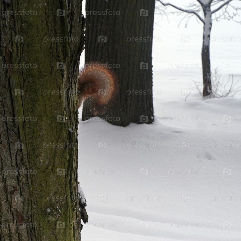 Рыжая белка бегает по стволу дерева на фоне белого снега
