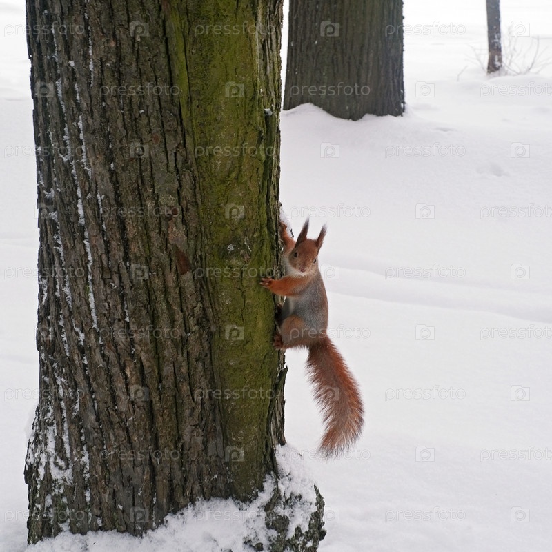 Рыжая белка бегает по стволу дерева на фоне белого снега