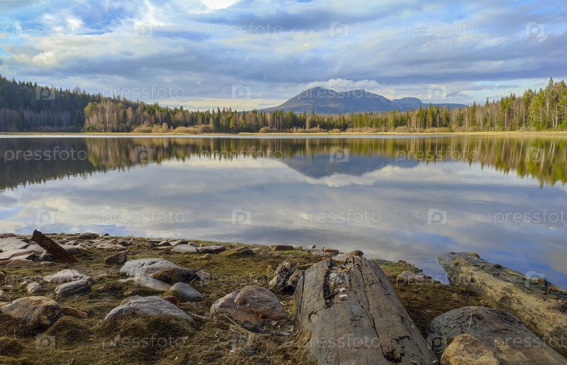 Природа России. Национальный парк Таганай.Весенний пейзаж. Горный хребет и лесное озеро на переднем плане