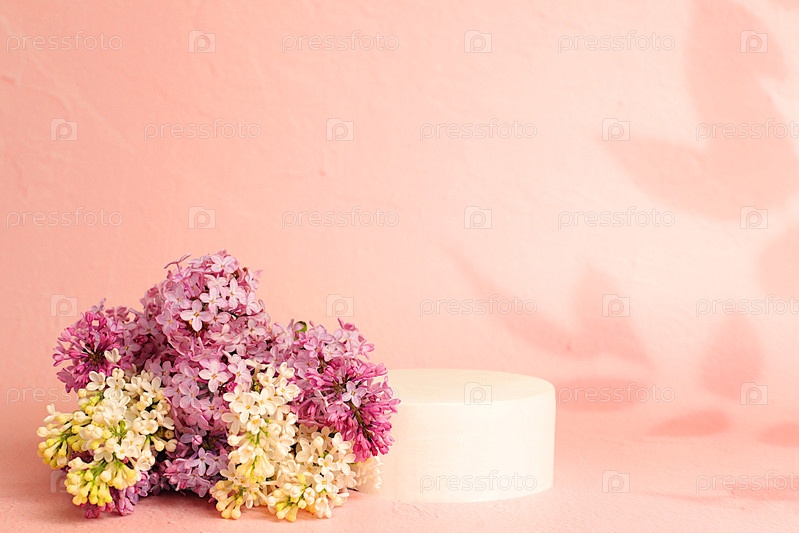 Абстрактная цветочная композиция с фиолетовыми цветами сирени, баннер. Пустой подиум с весенними цветами сирени. Креативный шаблон для вашего дизайна. Минимальная современная эстетика, элегантная концепция красоты
