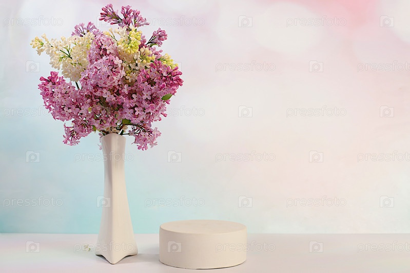 Абстрактная цветочная композиция с фиолетовыми цветами сирени, баннер. Пустой подиум с весенними цветами сирени. Креативный шаблон для вашего дизайна. Минимальная современная эстетика, элегантная концепция красоты