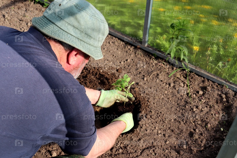 Пожилой фермер сажает росток арбуза в теплице, мужские руки в грязных перчатках погружают растение с комом земли в лунку