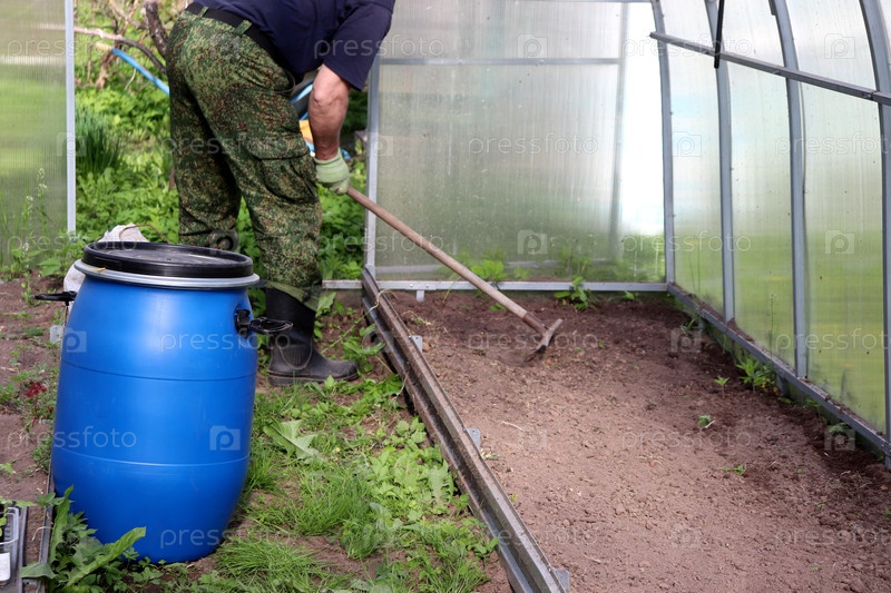 Пожилой фермер выравнивает почву после прополки грядки в теплице под посадку растений