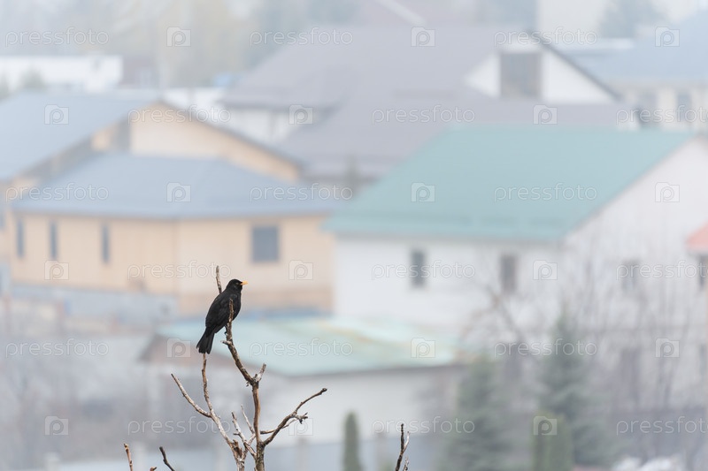 Черный дрозд на фоне частных домов