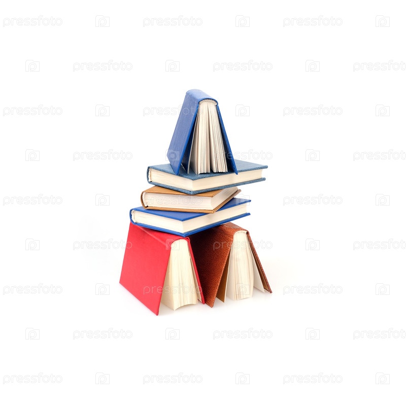 Стек книг в цветных обложках с белыми листами, изолированными на белом фоне
