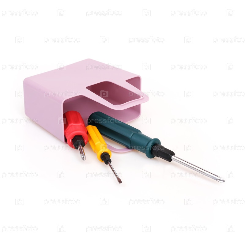 Ручные инструменты для ремонта и монтажа: комплект отверток в контейнере изолирован на белом фоне