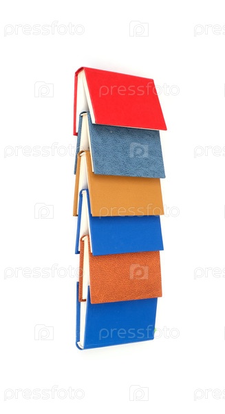 Стек книг в цветных обложках с белыми листами, изолированными на белом фоне
