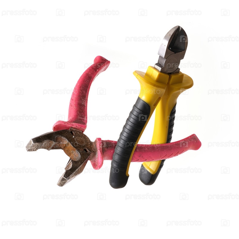 Изолированные ручные инструменты для ремонта и монтажа: старые плоскогубцы (композиция на белом фоне)