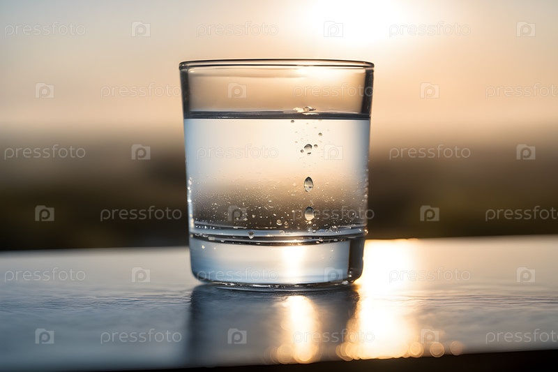 Закрыть вид на кристально чистый стакан воды с каплями, сверкающими на фоне безмятежного солнечного света