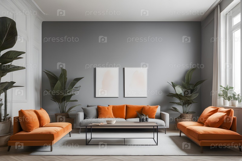 Интерьер гостиной с комнатными растениями и апельсиновыми диванами, подушками
