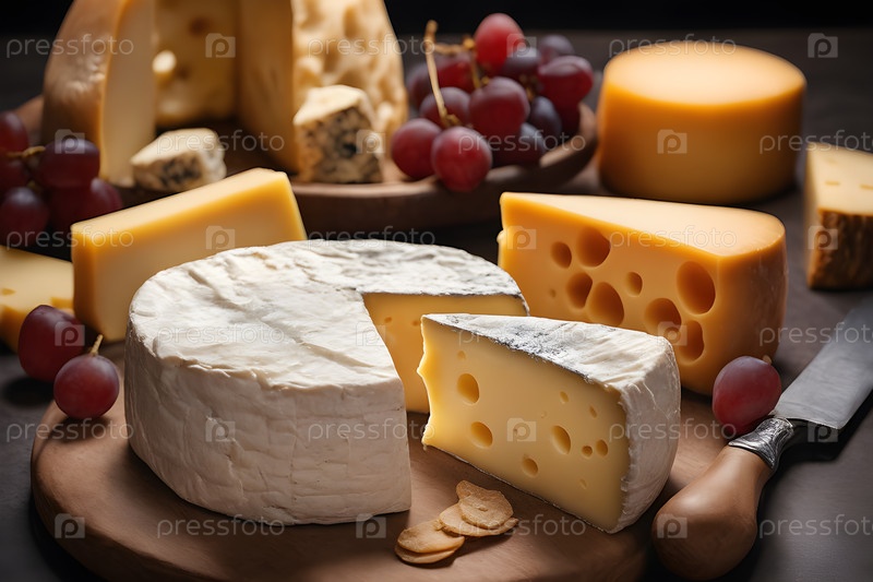 Закройте вид на восхитительный выбор кустарных сыров, захватывая сливочные, выдержанные и рассыпчатые сорта