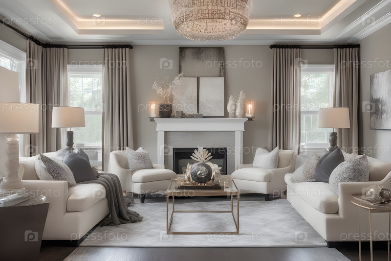 Гостиная в переходном дизайне интерьера, смешивая традиционные и современные элементы, нейтральную цветовую палитру с попами роскошных акцентов, плавное слияние комфорта и изысканности
