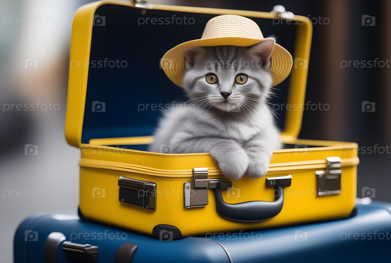 Симпатичный серый котенок в шляпе, сидящий на желтом чемодане, крупным планом, концепт путешествия