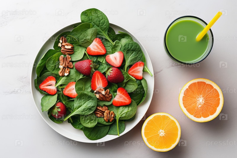 Вид сверху на красиво представленный салат в сопровождении свежего фруктового коктейля, на белом мраморном столе