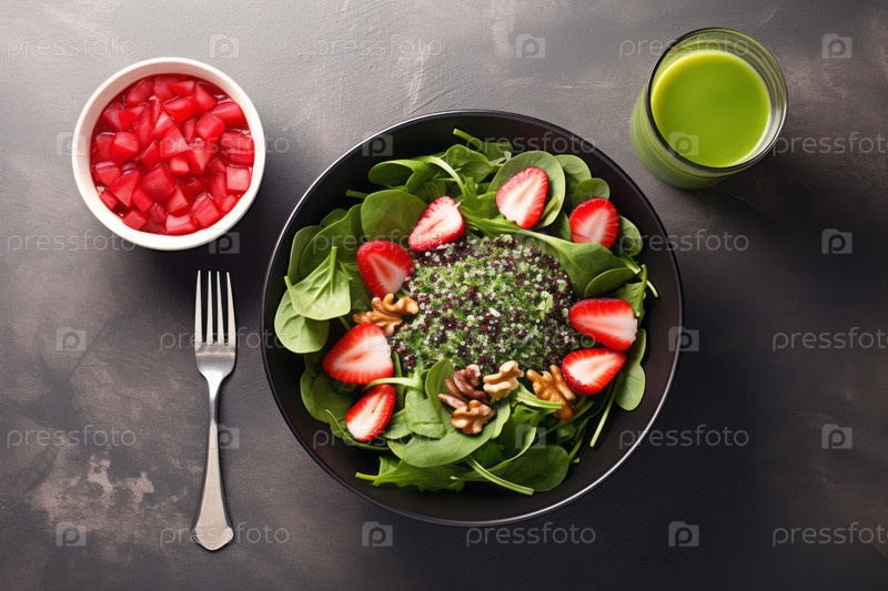 Вид сверху на красиво представленный салат в сопровождении свежего фруктового коктейля, на темном столе