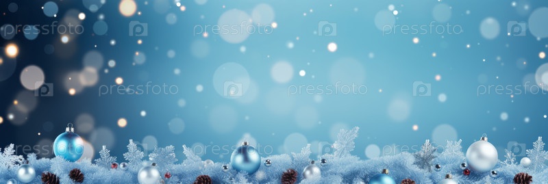 Рождественские украшения спереди на синем фоне с праздничными огнями боке, баннером, копировальным пространством